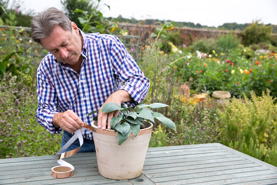 Alan Titchmarsh protecting protect hosta from slugs using copper tape around hosta in a pot Hosta Halcyon slug control protection protect 070916 07092016 07/09/16 07/09/2016 7 7th September 2016 Autumn Alan Titchmarsh Farley Hill Farley Hill Court Garden Berkshire photographer Sarah Cuttle portrait opener horizontal